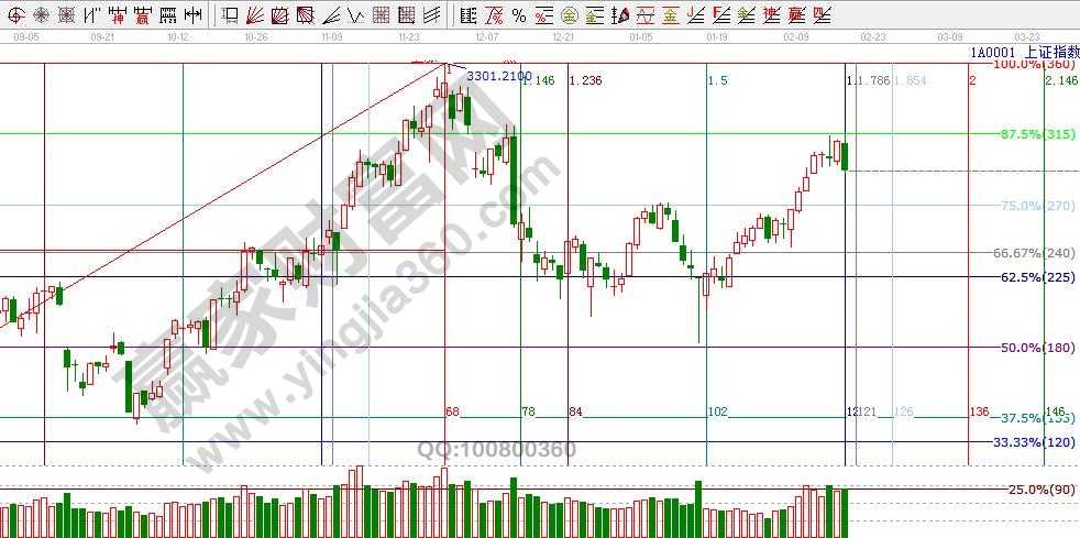 ☆依據(jù)贏家江恩理論系統(tǒng)江恩波段百分比線提示:16年5月26日2780點(diǎn)--11月29日3301點(diǎn)做波段百分比,315度阻力3236點(diǎn)附近,下方支撐位270度線3171點(diǎn)附近。