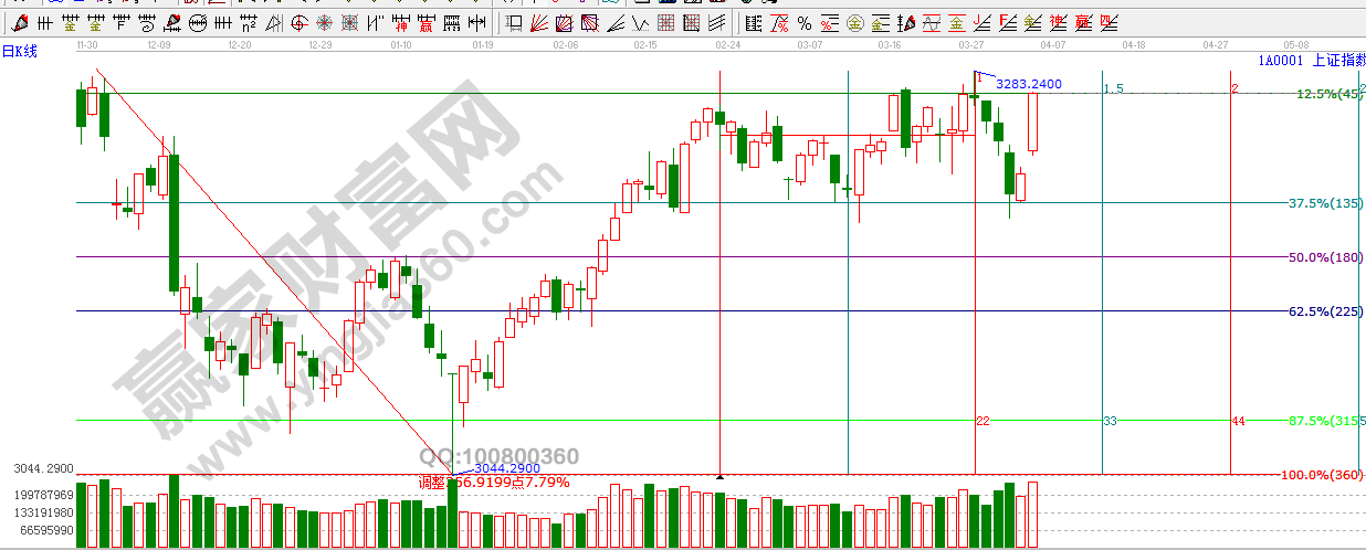 ☆依據(jù)贏家江恩理論系統(tǒng)黃金時間周期線提示:在沒有突破3283點之前,對應4月11日仍將是一個重要的日期。