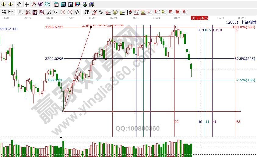 江恩看盤綜述:依據贏家江恩技術工具分析得出:周三,指數再次跳空下行,盤中破位3169點,最低試探至135度線附近,135度線3140附近有較強的支撐,另外,極反通道各短周期均處于超跌藍色線位置,那么接下來兩天將有短線筑底回抽的動作,介于目前整體趨勢處于日線生命線下方,趨勢弱勢。操作上,輕倉博弈為主,整體倉位5成以下。時間周期,重點關注4月25日左右時間窗口。板塊上,波段關注雄安新區,一帶一路等板塊。