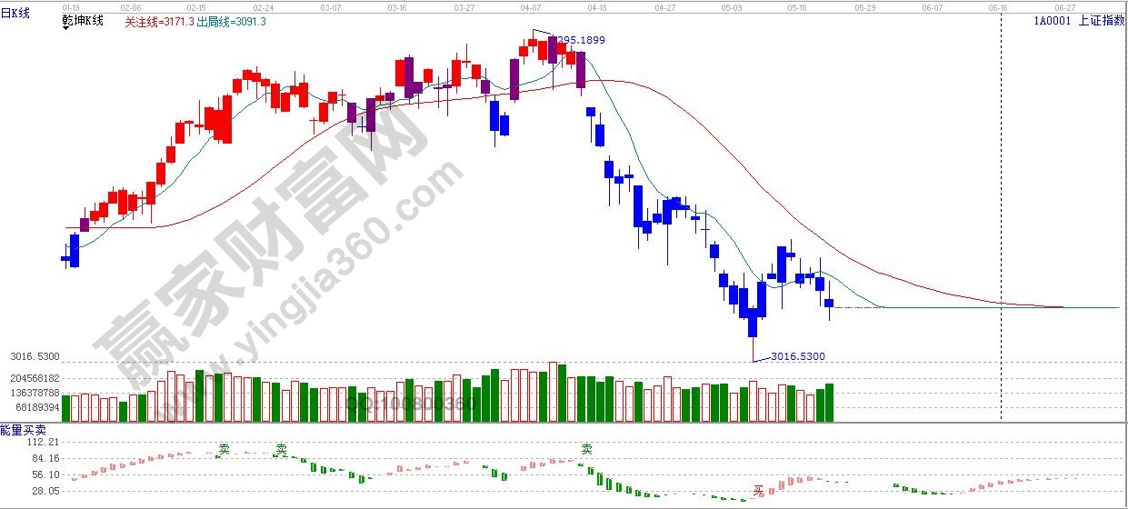 ☆依據贏家江恩理論系統乾坤K線提示:紅色關注線、出局線之下,藍色休息區域,依據規則,控制倉位,多看少動。
