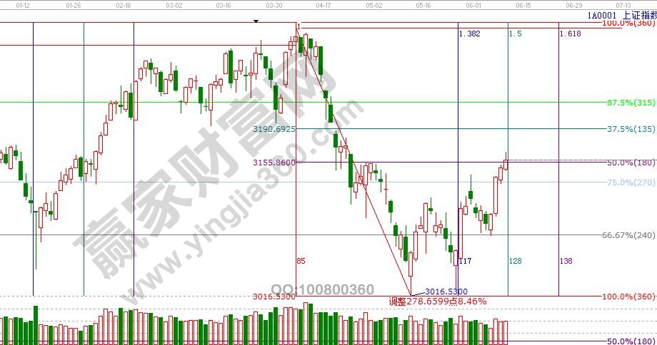 江恩看盤綜述:依據贏家江恩技術工具分析得出:上周,在多重利好的刺激下,股指連續反彈迎來四連陽,周五,收盤3158點收在日線生命線之上,量能依舊處于近期震蕩區間范圍,生命線突破有效性需要進一步確認,6月12日是1.5倍的窗口,留意量價變化。在上攻動能明顯不足的情況下,不可盲目追反彈,繼續關注中報業績預期良好的超跌股為主。