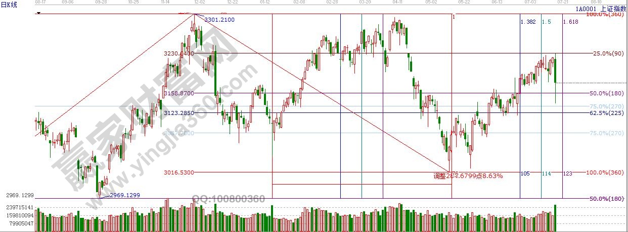 ☆依據(jù)贏家江恩理論系統(tǒng)江恩波段百分比線提示:滬指在阻力位如期展開調(diào)整,在270度3136點附近獲得支撐回升,明日關(guān)注180度3160點,3136點。
