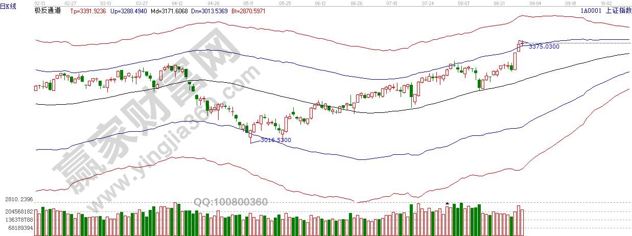 ★依據(jù)贏家江恩理論系統(tǒng)極反通道提示:滬指在3380點(diǎn)下方震蕩,藍(lán)色上軌線是3350點(diǎn)附近。