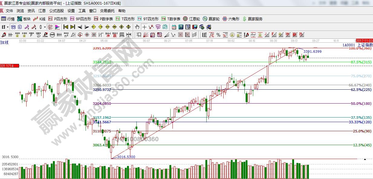 江恩看盤綜述:依據(jù)贏家江恩技術(shù)工具分析得出:周四,滬指小幅回升,反抽60分生命線3370點未果,午后再次回落。節(jié)前效應(yīng)明顯。短線活躍度可能會下降,有繼續(xù)回踩缺口的概率,但由于會前原因,調(diào)整空間不會太大,關(guān)注缺口3330點或日線生命線附近,調(diào)整就是低吸機會的策略不變。操作上,逢低建倉加倉有業(yè)績支撐優(yōu)質(zhì)標的,另外,關(guān)注每天輝煌中國中提到的標的。