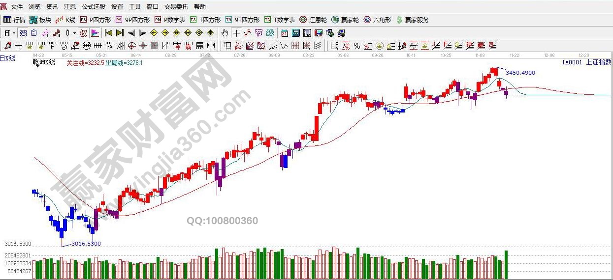 ★依據贏家江恩理論系統乾坤K線提示:紫色k線,破位紅色關注線,依據規則,看空。