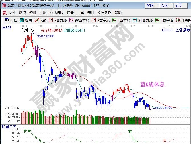 ☆依據贏家江恩理論系統乾坤K線提示:藍色K線代表波段休息,收盤價在短期出局線下運行,短線、波段看空。