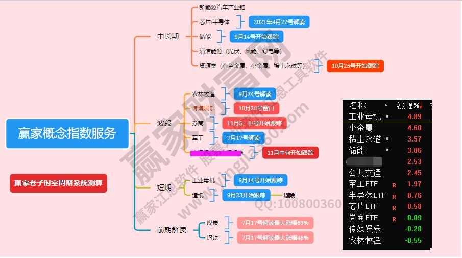 贏家概念指數點睛:贏家行業研究部依據老子時間數列測算行業周期密碼,判斷行業、概念漲跌時間。行業研究部測算,9月24號納入的娛樂傳媒,并測算10月28號窗口將啟動主升,該指數28號精準上攻,同時解讀的券商走勢弱于預期。2021年整體板塊輪動抓的不錯,4月份芯片、半導體、5月份開始資源股小金屬,7月份軍工、煤炭、鋼鐵,9月份儲能,農林牧漁、工業母機,風光,其中也有表現不強的造紙,這個已經剔除了。11月8號行業研究部通過老子時間數列進行最新測算,****板塊本月中旬開始跟蹤;更多板塊正式學員區公布,非學員聯系贏家工作人員。