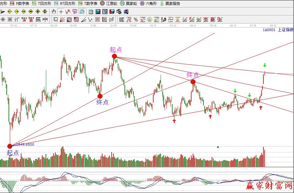 從2014年7月30日開始之后,大盤開始在下降速度阻力線的1/3速度阻力線位置盤整,其后還出現(xiàn)回踩的一次,但是最終沒有跌破這一支撐線后一路上揚(yáng)到上升阻力線2/3速度阻力線位置進(jìn)行壓力突破和確認(rèn),歷時(shí)兩個(gè)月后才繼續(xù)上漲行情,之后指數(shù)因?yàn)樽C券、銀行和保險(xiǎn)等權(quán)重股的帶動(dòng)下,一去不回頭,沖出了阻力線走出新的行情。7月30日到現(xiàn)在差不多五個(gè)月了,最近卻讓我又感到了震撼,不得不說江恩理論是值得我們后人去學(xué)習(xí)研究的。江恩速度阻力線更多神奇之處等待大家的研究和開發(fā),在股市操作中只有自己用心才會(huì)有收獲,希望大家收獲自己的財(cái)富。