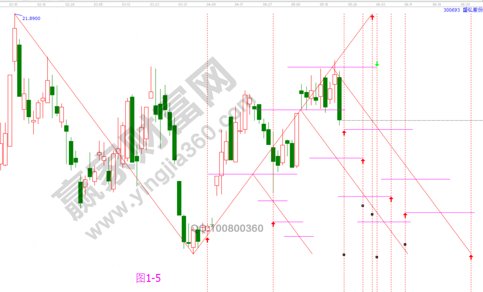 如圖1-3所示,與前兩圖對應(yīng)0425這四個點,這個圖一做出來也不需要說太多了(本文出自贏家財富網(wǎng)轉(zhuǎn)載請注明出處)。理想運動是股價用44天從11.67(0)波動到21.89(4)再用44天從21.89(4)波動到11.67(2)。注意:轉(zhuǎn)折趨勢線運用的第一個點:重點關(guān)注斜線!!!斜線42界定了兩個性質(zhì)的三角形區(qū)域,三角形234為下跌的時間換取下跌空間區(qū)域。股價持續(xù)運行于此區(qū)域,易創(chuàng)出11.67的新低,為逢高拋售區(qū)域;三角形241區(qū)域為下跌的空間換取下跌時間區(qū)域,股價持續(xù)運行于此區(qū)域,不易創(chuàng)出11.67新低,易創(chuàng)出21.89新高,為逢低吸納區(qū)域。此區(qū)域如何高拋低吸?見圖1-4!
