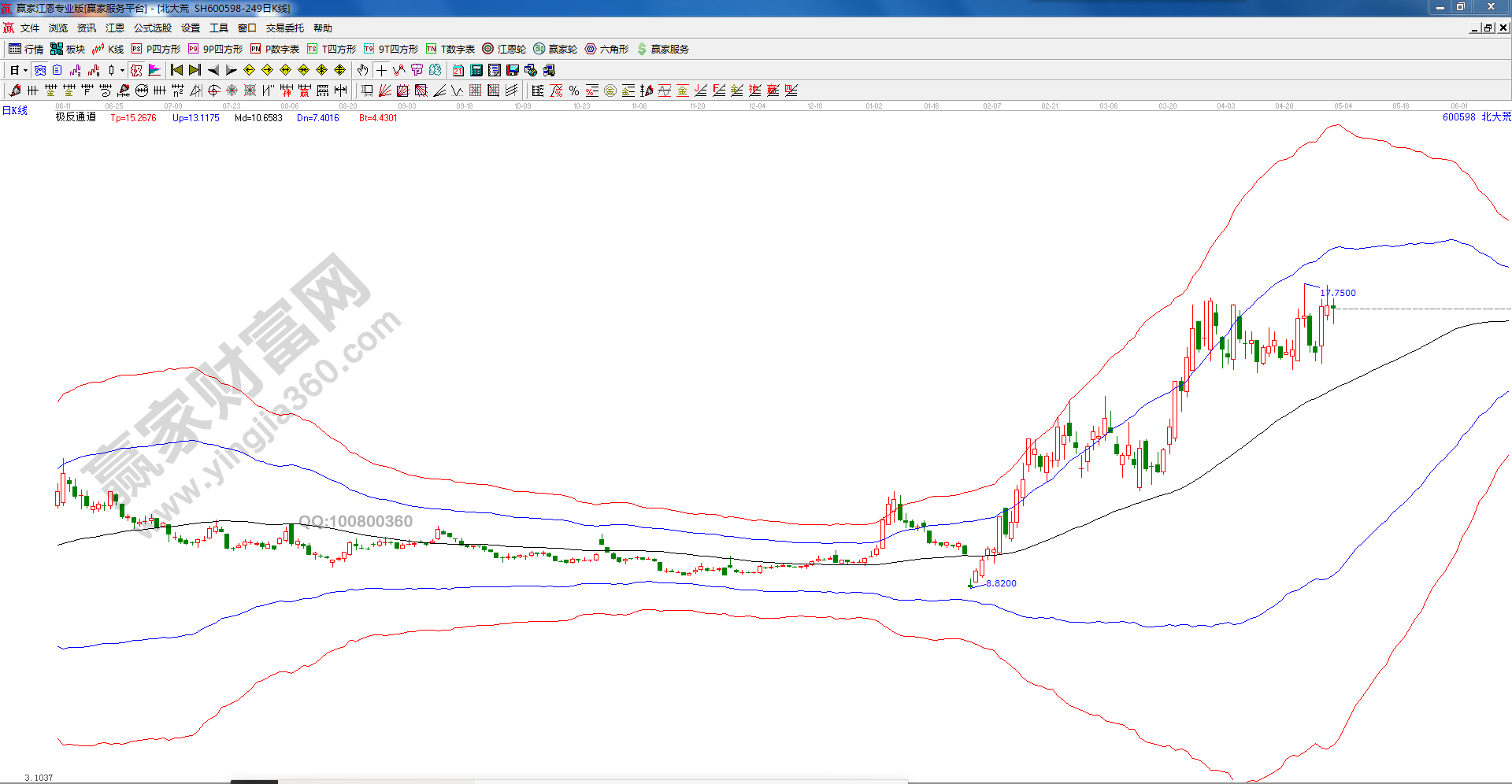 600598北大荒是近期贏家VIP微信群里一名學員操作的股票,圖一里我們通過紅色五彩K線標記出了該股自2019年6月11日至2020年4月30日內所有漲幅大于4個點的中大陽線,圖二是該股自2019年6月11日至2020年4月30日的極反通道圖。通過對比,我們發現一個明顯的規律:中大陽線多出現于極反通道的生命線以上,當下散戶多喜愛短線操作,這也的確是適合散戶資金量小、發揮快進快出優勢的一種操作模式,而短線操作最重要的一點就是一旦介入股票之后需要出現中大陽線快速脫離成本,目的是為了安全,因此短線交易追求的目標必須是中大陽線。通過兩張圖的對比,我們可以直觀的發現極反通道解決了這個難題,說白了想收獲中大陽線,股價必須運行在極反通道之上。如果說股市是一個金礦、一根根中大陽線是金光閃閃的金子的話,那么極反通道生命線就是尋龍分金的龍脈所在,由于篇幅限制本文只舉一例,有興趣鉆研和驗證的朋友可以多找股票案例按照以上的方法對比進行概率統計,我可以很確定的告訴大家,結論還是這樣的:中大陽線必大概率出現在生命線之上!!!