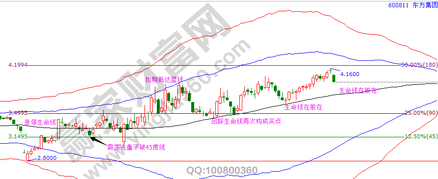 其次,謹記——“生命線在,股在”。低吸入場的股票,要有持股條件,未擊穿止損位應耐心持股。在生命線附近低吸的個股,從進場就要明白預期上漲空間是藍色上軌線,只要不破生命線就有去藍線的機會,那么,生命線在股在。這里注意一點,有部分個股會圍繞生命線上下幾個點震蕩修復,此類個股可以結合江恩百分比來確認止損位,不破百分比線均可視為生命線處正常整理,當時間到達,一樣會給出到藍線的機會。(如圖600811東方集團)