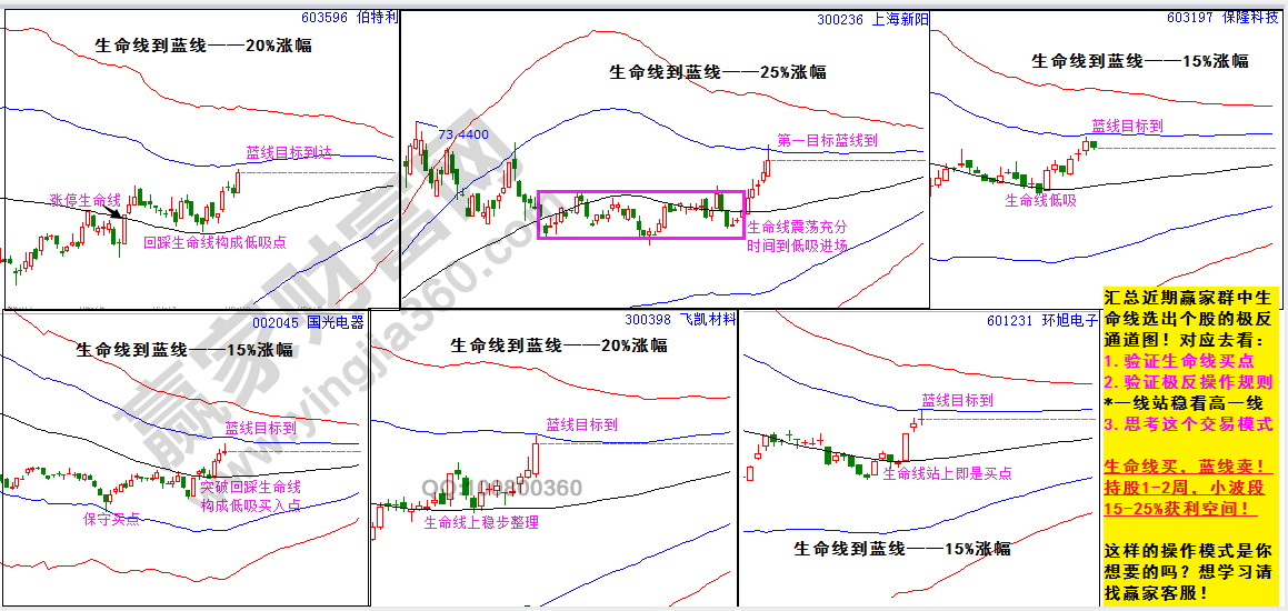 極反通道作為贏家江恩獨有的經典分析工具,接觸過贏家的朋友基本都有了解。只有簡單的5條線,能靈活應用,則:選好股-判趨勢-找買賣-算空間,都可以有效解決。其中,生命線作為強勢股票的啟動點,買在生命線就是買在起漲點,上漲第一目標即為藍色上軌線!那么,生命線入場,上漲到藍色上軌線高拋,持股1-2周,獲利15-25%,就是現(xiàn)在要分享給大家的經典小波段盈利模型。