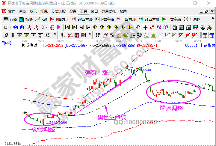 首先,它可以作為是否值得操作的重要參考,生命線上可以考慮進行關注操作,而生命線下就可以暫時不用關注;其次就是,買賣參考點,生命線既然是均線,那么它同樣的就具有均線的特質,也就是說,它們有著支撐和壓力的作用,那么投資者就可以在股價在生命線獲得支撐的時候進行買入操作,而在跌破生命線的時候進行賣出操作。除了這些常見的股票生命線外,贏家極反通道中也同樣有一條生命線,它可以說是股票趨勢強弱的分水嶺,依據(jù)股價與生命線的關系:股價在生命線以上,則股票強勢可以操作;股價在生命線以下,則股票弱勢暫不考慮。同時生命線是一個強勢股的啟動點,操作生命線附近的股票穩(wěn)健且強勢,如果說一個股票在剛剛啟動的時候就把握住了,那么把握住的就是這個股票最好的行情。這里可以記住一個操盤口訣:生命線上強勢走,生命線下難抬頭;紅藍兩條外軌線,支撐壓力顯勢頭。需要注意的是極反通道中的生命線,甚至是其它4條線都不是大家所熟知的均線。