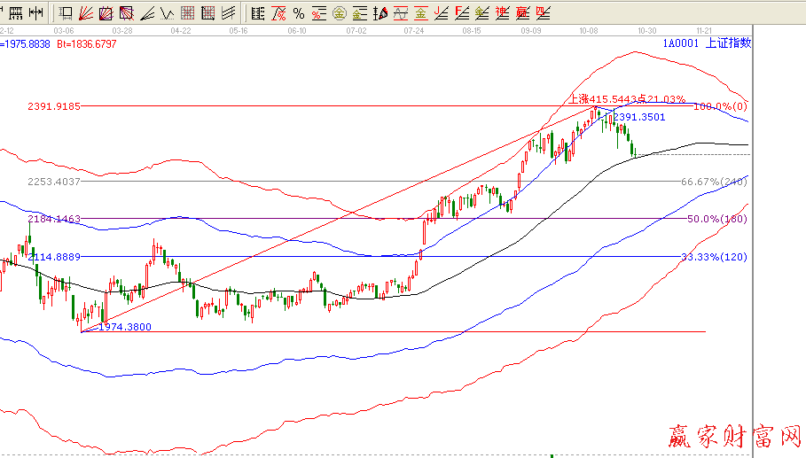 技術面分析:依據贏家江恩系統極反通道提示,下周繼續關注2290這個位置,下方支撐2290附近。接下里的二天要特別注意生命線的支撐點,不破生命線反彈希望比較大,一旦破生命線下方支撐就看60日線了即2270附近昨日大盤已經走成下跌三部曲形態,而今日大盤一度頑強上漲,但無奈沒有足夠的支持。量能的萎縮很好的說明了這一點,多頭無意拉升。但今日收出十字星,在此位置亦有變盤的意思,而且今日縮量明顯,亦讓人相信下周一或迎來反彈。
