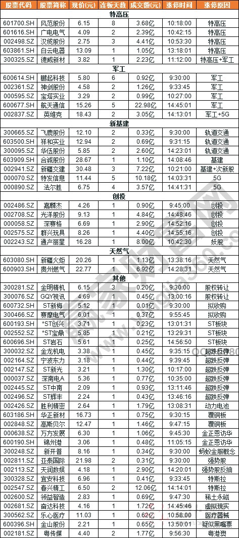 盤面上,天然氣板塊午后異動,貴州燃氣(600903)、新疆火炬(603080)強勢封板;ST長油(601975)盤中先后兩次停牌,收盤大跌23%;高鐵軌交板塊開盤持續強勢,永貴電器(300351)、祥和實業(603500)、寶塔實業(000595)、飛鹿股份(300665)集體封板;風范股份(601700)強勢收獲八連板,帶動特高壓板塊走強,漢纜股份(002498)、廣電電氣(601616)漲停;券商板塊異動,西南證券強勢沖板。