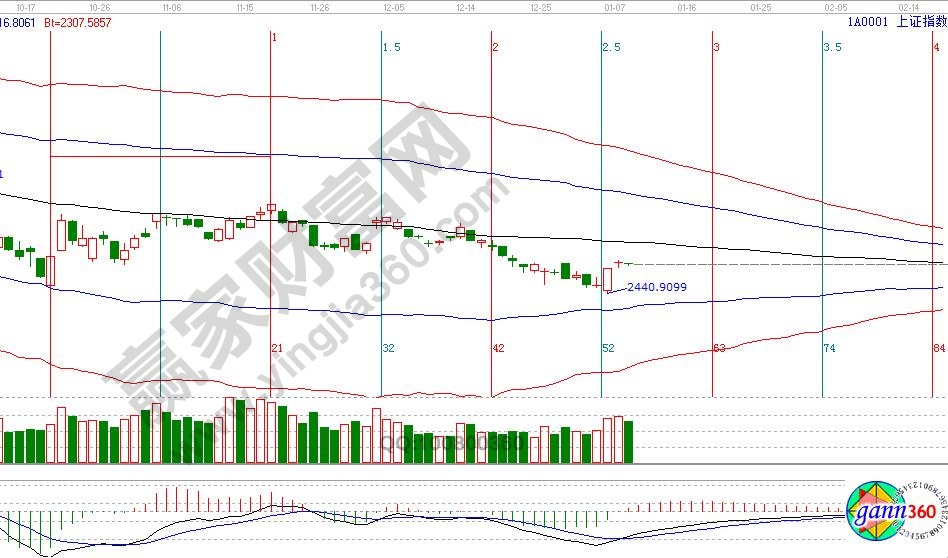 大盤日K線連續兩天窄幅震蕩,短期橫盤進入方向選擇期,目前依然處于2400點反彈周期內,9號江恩價格四方形提示,第一支撐45度2516點,第一壓力0度2547點,時間窗口,1月15日、23號為日線時間窗口。操作策略,大盤日線未收復生命線前波段休息,短線當前處于上漲周期,盤中遇壓力短線高拋,15分鐘生命線2516附近不破,短線逢低做多,本輪短線反彈底線是2478點不破,高度為日線生命線2585附近。