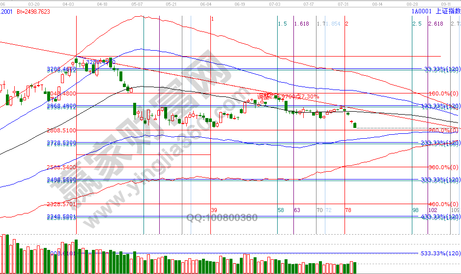 7月30號波段百分比延伸線零度位2966點受阻,8月1號時間窗口跌破極反通道生命線趨勢轉弱,重要的這些關鍵位都是提前給出。下跌已確認開始,本輪調整的目標位在7月中旬內部VIP學員培訓課上已提出,市場正在按著當時所講的路徑運行,穩健投資者需要耐心等待月線級別信號,激進者可以參考周線生命線信號,5號下午在學員區從實戰角度再次給學員講解極反通道周期共振信號,這是調整期開倉交易信號之一,同時主回調期板塊都在不斷進行解讀。預期7號確認此信號,8號是24節氣立秋,空間上波段百分比延伸線120度2791、江恩價格四方形2800為支撐,綜合結論是7號確認周期共振信號(學員區盤中會通知),激進者可以開倉短線博弈。最后講一點,3季度市場會給出一個極重要底,關于時間與位置學員關注學員區。8月6號盤中壓力是315度2844點,盤中支撐是180度2800點、135度2786點,8月時間窗口9號、16號、24號。操作策略,指數極反通道生命線進入弱勢通道,按失守一線看低一線規則藍色下軌線是目標位,短線跟蹤好15、30周期共振信號,激進者控制在3成以內交易。