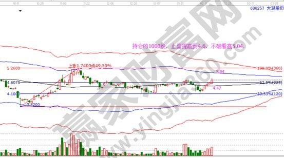 1. 大湖股份1000股持倉,當前在生命線上方走勢穩健,生命線位置4.47不破屬于強勢,短線及賬戶的情況,建議止盈提高到225度支撐4.6,4.6不破,持股看高5.04;4.6擊穿,獲利出局,資金和精力放在被套個股上。