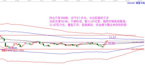 2. 國星光電,持倉只有300股,浮虧5個多點,倉位輕套的也不多。股票在生命線上震蕩運行,走勢穩健,10.96是當前支撐點,可以此位置做止損,不破看高11.67,屆時再定。