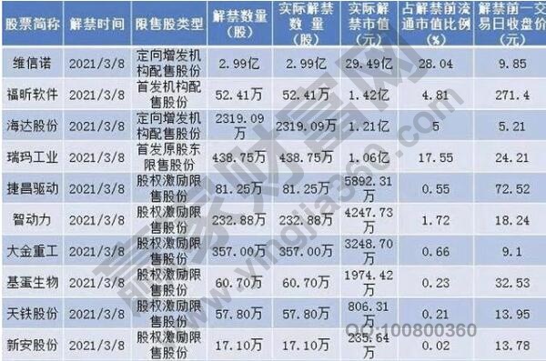 其中,有四只股票解禁市值超億元,分別是福昕軟件解禁市值1.42億元,52.41萬股,占比前流通市值4.81%;海達(dá)股份解禁市值1.21億元,2319.09萬股,占比前流通市值5%;維信諾解禁市值29.79億元,2.99億股,占比28.04%;、瑞瑪工業(yè)解禁市值1.06億元,438.75萬股,占比前流通市值17.55%。定向增發(fā)機(jī)構(gòu)配售股份是海達(dá)股份,維信諾,首發(fā)原股東限售股份是瑞瑪工業(yè),福昕軟件。