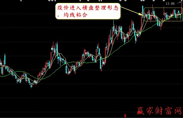 一般而言,一旦上升趨勢轉勢,投資者就該及時留意均線,在市場創出階段性新低后,均線往往會出現一次粘合,即長期均線與短期均線互相纏繞在一起。