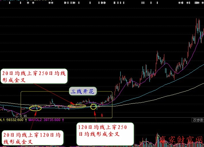 三線開花主要指的是20、120、250這三條均線形成了金叉并各自穿越,像一朵盛開的花兒一樣,這就叫做三線開花。此形態的出現向我們傳達著一些重要的信息,因此應該引起投資者的重視。除此之外,在三線開花中,120日均線與250日均線距離極其接近,或者120日均線與250日均線處于交叉穿越的狀態或處于粘連并行的狀態,最后形成極度分離的多頭排列的特殊的技術形態。當然,三線開花有自己的獨特特征,那就是此時20日均線向上穿越120日均線和250日均線的叉點處,因此投資者在判斷三線開花的形態應該認真觀察。