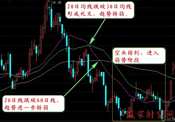 2.其次,讓我們看看利用均線怎樣來(lái)判斷股市的強(qiáng)勢(shì)階段轉(zhuǎn)為弱勢(shì)階段的狀況。而此過(guò)程的變化同樣也不是一個(gè)一蹴而就的過(guò)程,而是一個(gè)循序漸進(jìn)的過(guò)程。首先,當(dāng)我們看到當(dāng)大盤(pán)日K線上的20日均線彎曲向下與30日均線形成死叉時(shí),那么此時(shí)的股市向我們傳達(dá)著一個(gè)十分重要的信號(hào),那就是大盤(pán)已經(jīng)漸趨轉(zhuǎn)向弱勢(shì),此時(shí)的投資者在操作的時(shí)候應(yīng)該謹(jǐn)慎,及時(shí)離場(chǎng),否則你將會(huì)被套牢,陷入不可自拔的窘困之地。隨后,繼續(xù)觀察股市的變化,當(dāng)20日均線繼續(xù)下滑與60日均線形成金叉時(shí),通常投資者會(huì)在此時(shí)感到欣慰,因?yàn)檫@是一個(gè)上漲的信號(hào),其實(shí)不然,它反而更加強(qiáng)烈的反應(yīng)出股價(jià)的進(jìn)一步的轉(zhuǎn)弱。而當(dāng)30日均線彎曲向下與60日均線形成死叉時(shí),說(shuō)明大盤(pán)已經(jīng)轉(zhuǎn)弱了,此時(shí)的交易量出現(xiàn)了銳減的現(xiàn)象,大盤(pán)一片死寂沉沉的現(xiàn)象。最終,20日、30日、60日均線都呈空頭排列時(shí),才標(biāo)志著大盤(pán)已進(jìn)入了弱勢(shì)勢(shì)階段,此時(shí)投資者已經(jīng)對(duì)股市死心了。但是,值得我們注意的是,大盤(pán)也有翻盤(pán)的可能,因此投資者需要做好兩種準(zhǔn)備。