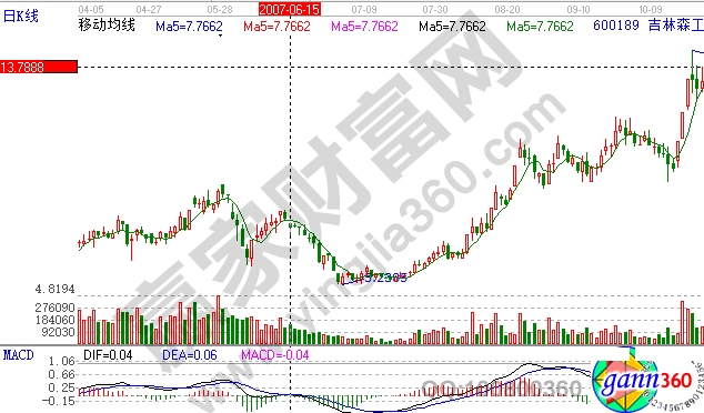 吉林森工(600189):該股票從2007年6月15日到7月5日,一直被5日均線壓制的,在7月6日的時候,主力運用大陽線突破了5日均線,在上漲了1天之后再次跌破了5日鞠新年,而在7月17日又突破了5日均線,7月18日小陽線回抽了5日平均線,直上漲到8月1日跌破5日平均線,期間漲幅15%。8月7日,該股再次突破后連續上漲了60%。