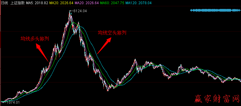時間周期較小的短期均線運行于時間周期較大的長期均線下方,并且均線都向下發(fā)散,我們將這種排列稱之為空頭排列。