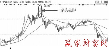 中國石化(600028)大幅上升后,就在高位出現穿頭破腳K線組合,股價見頂后就開始大幅下跌,如圖所示。
