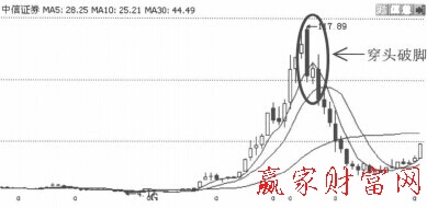 如果在周線或月線中出現穿頭破腳K線組合,則該股票要長期看空、做空,不要輕易進入該股票,下圖是中信證券(600030)在月K線中出現的穿頭破腳K線組合。對于短線選股朋友們還是可以認真的了解一下的。