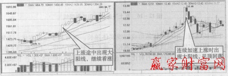 光頭光腳大陽線(以下簡稱大陽線,如下圖所示)實體較長,可略帶上下影線,表明多方取得了決定性勝利。實體越長,多方力量越強。大陽線可以出現在任何情況下:1.上漲剛開始時出現大陽線,相當于在股價受到向上的外力而向上運動時,又受到一個很強的向上的力,股價將加速上漲;2.上漲過程中出現大陽線,相當于在股價向上運動的途中,又受到一個很強的向上的力,股價繼續看漲;3.連續加速上漲中出現大陽線時,則多方能量可能已經耗盡,股價將見頂回落;4.連續下跌中出現大陽線,則是在空方能量已經耗盡的情況下提供一個向上的力,股價將見底回升。