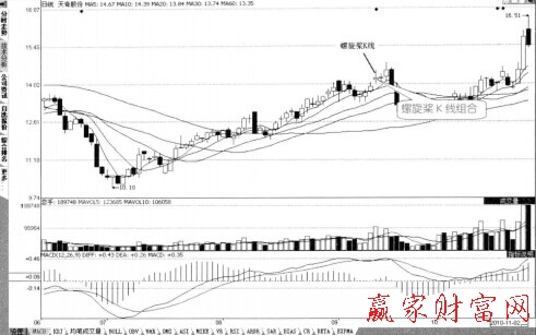 2.如果在漲勢(shì)中出現(xiàn),表明后市看跌。例如個(gè)股天奇股份(002009)在上漲的過程中出現(xiàn)螺旋K線,后市出現(xiàn)下跌行情。