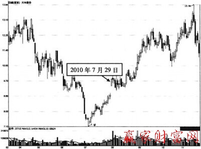 如圖3所示為大冷股份(000530) 2010年3月26日至2010年11月17日期間的走勢K線圖。此股在深幅調整后的低位區出現了穩健的反彈上漲走勢,隨后,在2010年7月29日,此股于反彈中出現了一個高開高走、強勢上封漲停板的K線形態。這是主力資金短期有憊強勢拉升個股的信號,也預示著一波強勢的反彈上漲走勢將展開。由于個股前期的下跌幅度較大,階段性的反彈幅度很小,因而,在實盤操作中,我們可以進行較為積極地追漲買股操作。