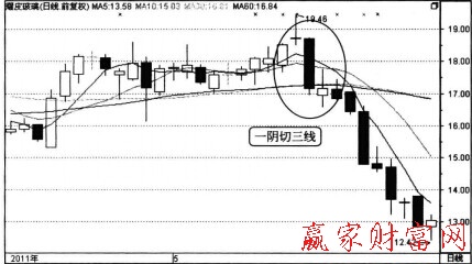 一陰切三線也可稱為斷頭鍘,斷頭鍘很形象地說明了這種K線形態對股價和未來走勢的影響。此時空方勢力突然爆發,多頭能量被迅速打壓,出現這種情況后一定要注意尋找賣點。