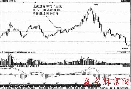 觀察上面兩圖,在上漲途中出現了看漲三線直擊后,股價經過短替的調整繼續向上運行,因此看漲三線直擊中的最后一根大陰線只不過是主力在拉升股價過程中的是一次洗盤,這種洗盤行為井不會改變股價原有的運行趨勢。