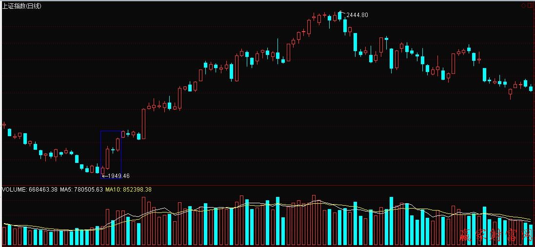 根據(jù)對中國股市大盤底部的歷史規(guī)律研究,我們發(fā)現(xiàn)了一種簡單的判斷大盤底部的方法。即底部彈升的四根K線組合進行研判。
