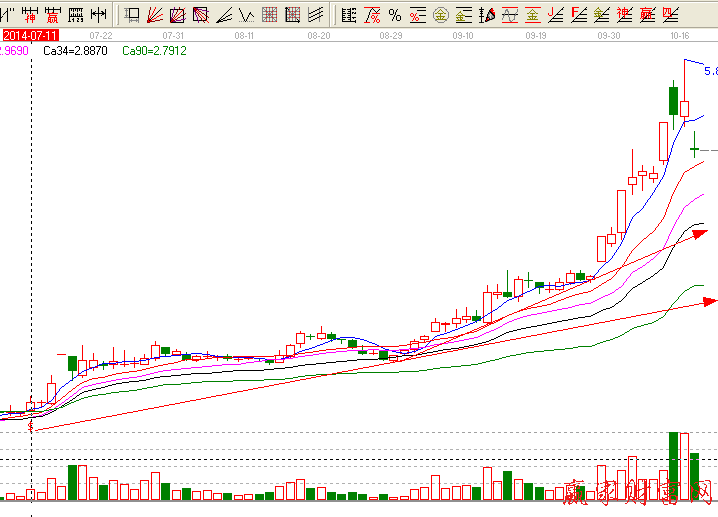 2.對于均線系統有小幅發散且5日均線和10日均線在30日均線上方振蕩的個股,顯示有明顯的莊家入莊跡象,當股價回檔至30日均線時為最佳買入時機,投資者可大膽介入。