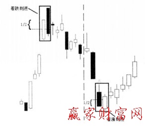 例如下圖所示,為新農開發(600359)于2011年3月3日左右形成的看跌刺透形態。從圖中標志區可以看到,在前期市場迅速拉起,股價挺拔上行的末端,該看跌刺透形態的形成催促了上行趨勢的反轉,翌日對近日低價的下探,并在后幾個交易日趨勢得以確認后,市場不斷下行,漲勢不再。