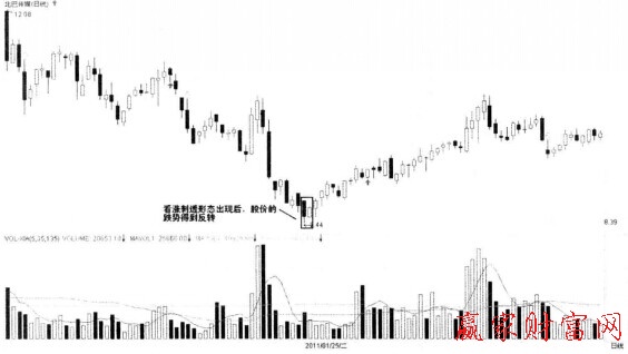 2.前期下降趨勢所持續的時間越長,股價下行坡度越陡,降至價格越低,看漲刺透形態的反轉實力越強。看漲刺透形態形成后,對趨勢反轉進行確認的陽K線越長,等待確認的時間越短,該形態的反轉實力越強。看漲刺透形態的前根陰K線越短,后根陽K線越長,插入前根陰K線實體的內部越深,該形態的反轉實力越強。
