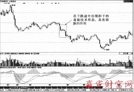 下檔盤旋技術形態特征:股價經過一輪下跌后進入了小陰小陽地橫向整理,隨后出現一根跳空下跌的陰線,將前一段整理格局打破。