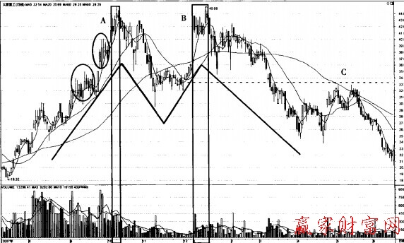 如圖所示,該股股價經(jīng)過長期大幅上漲,在股價的高位出現(xiàn)一個傳統(tǒng)理論中的M頭,之后股價開始迅速下跌并跌破前期低點,C點股價回抽前期低點確認了這個逃逸形態(tài)的成立,該股進人照市運行周期。