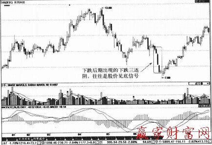 當下跌三連陰技術形態出現在股價連續下跌后期時,是空方能最耗盡的一種表現,如果此時成交量也急劇放大,往往是跌勢將盡的一種信號,行情將要發生改變,此時手中持股的就不可再賣出股票,而是等待股價止跌回升。因為滬深兩市個股在下跌后期出現下跌三連陰技術形態后觸底反彈的例子屢見不鮮。