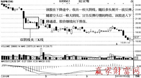 雙陰線夾三K線形態屬于持續形態。在下降趨勢中的雙陰線夾三K線形態中,如果頭、尾兩根陰線對應的交易量超過了中間那群小K線的交易量,那么,該形態的分量就更重了。