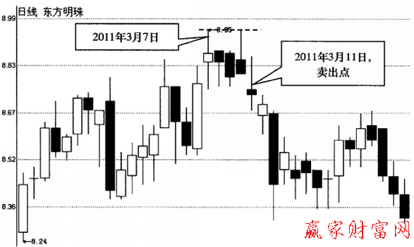 如圖所示,東方明珠(600637)的股價從2011年1月下旬開始觸底反彈,2011年3月上旬到達階段性頂部,其中2011年3月7日和10日所收出的K線最高價都是8.95元,從而形成了平頂線形態。成熟的投資者一般會在3月10日形成平頂線的當天使實施減倉操作。