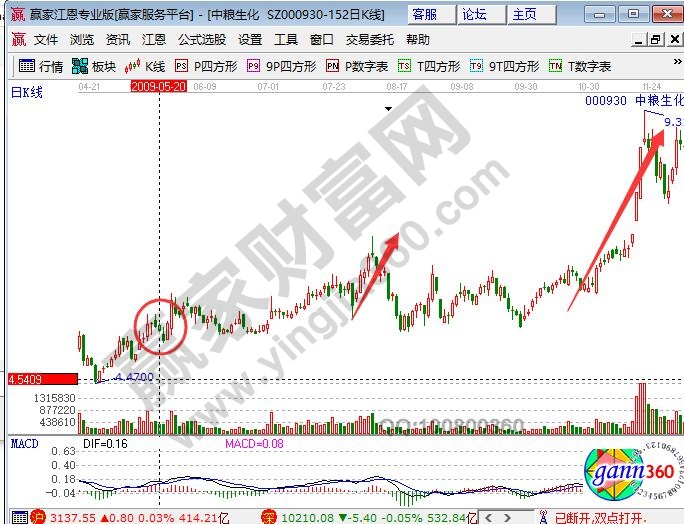 再如日線如下圖000930中糧生化,2009年5月19號(hào)至5月25號(hào)的走勢形態(tài)。符合鳳凰三點(diǎn)標(biāo)準(zhǔn)形態(tài)。該股第五天大陽報(bào)收,隨后調(diào)整依然未跌破5月21號(hào)低點(diǎn),休整結(jié)束后走出漲幅50%的行情。