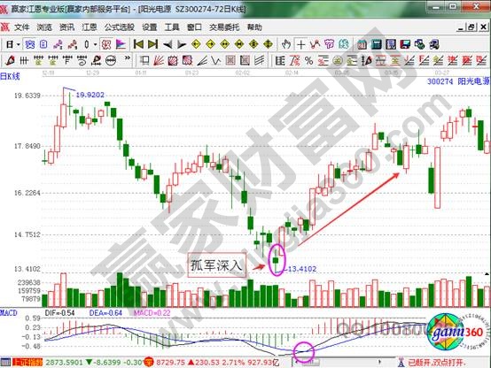 在陽線出現(xiàn)之后,K線終止了下跌趨勢,開始反彈上漲,走出了一波比較強勢的上升行情,不就macd在零軸之下比較遠(yuǎn)的位置拐頭向上,形成了金叉,這就符合了孤軍深入形態(tài)的第三個條件。
