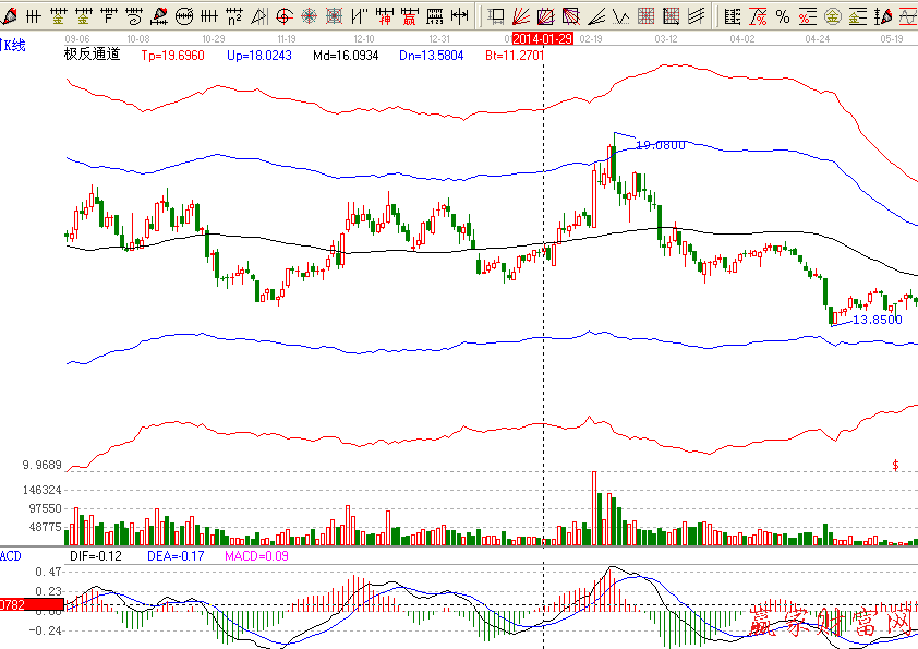 4在MACD指標中,紅色能量柱和綠色能量柱,分別代表了多頭和空頭能量的強弱盛衰。它們對市場的反應,要比短期均線DIF在時間上提前。在MACD指標中,能量釋入的過程,是一個循序漸近的過程,通常是呈逐漸放大的。在東方哲學中講求,”陽盛則衰、陰盛則強”。在使用能量柱時,利用紅色能量柱結合K線走勢圖就得出,當K線走勢圖近乎90度的上升,加之紅色能量柱的快速放大,預示著大勢的頂部已近。尤其是相鄰的兩段紅色能量柱產生連片時,所爆發的行情將更加迅猛。反之,在空頭市場中,這種現象也成立。在熟悉了這種操作手法后,對投資者逃頂和抄底將大有益處。