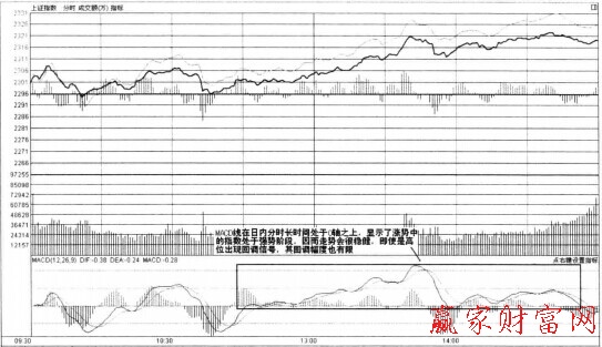 如下圖所示,為上證指數的日內分時走勢中出現的MACD線在0軸之上的強勢形態。從圖中標志區可以看出,指數走勢一路飄漲顯示著強勁的上漲勢頭,因而MACD線雖然多次嘗試向下死叉,但都作為騙線指標而草草收場,顯示了在強勢行情之下,賣出信號失靈的特征形態。