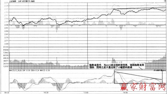 再比如下圖,為上證指數日內分時走勢中形成的MACD線與走勢背離的形態。從圖中標志區可以看出,指數兩處高點不斷上升,而MACD線指標仍在0軸之上強勢運行,頻繁出現頂背離形態,使得指數必須做出回落的走勢,但指數走勢回調幅度有限,只是窄幅地小調整了下走勢,因而在漲勢中選擇賣出信號時不宜倉促,應冷靜地等待賣點信號準確出現后,再及時清倉。